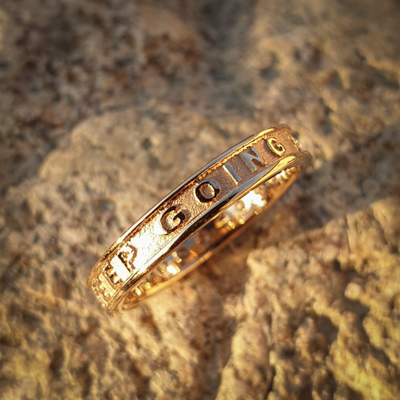 Lisainfo: Sõrmusel ühel pool kiri: Keep Going ja teisel pool kivid.