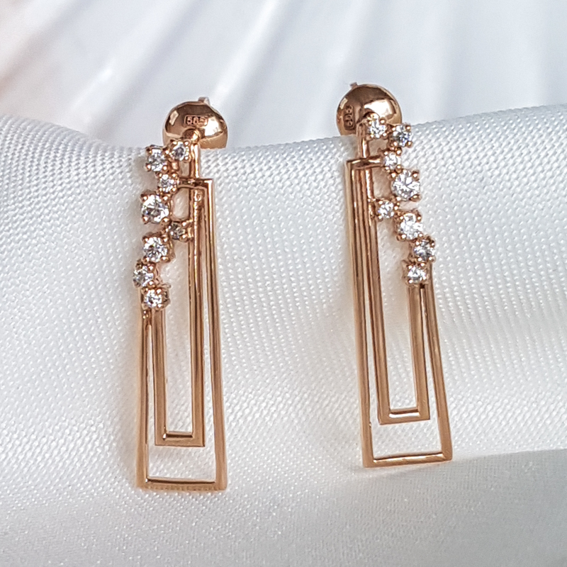 Kuldkõrvarõngad tsirkoonidega. Kruvikinnitused. Prooviga 585. Kaal 3,66g.