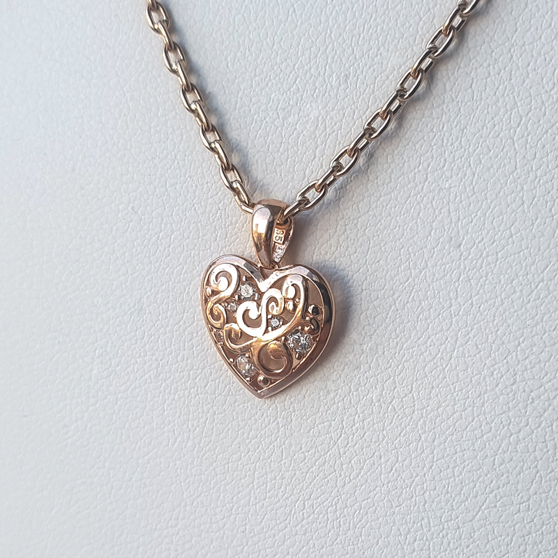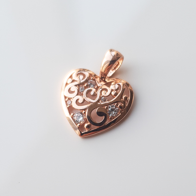 Südamega kuldripats. Punane kuld 585 proovis. Südame läbimõõt 11mm. Ehte kõrgus koos öösiga 17mm. Kaal 0,45g.