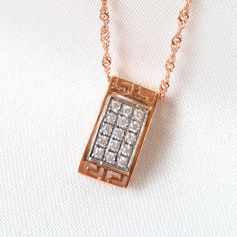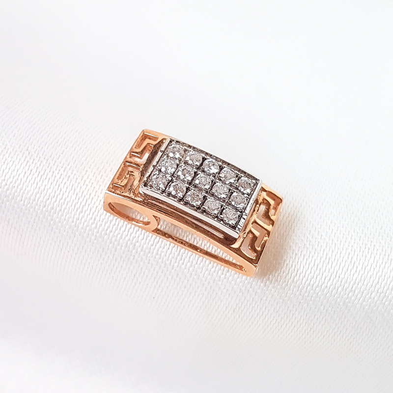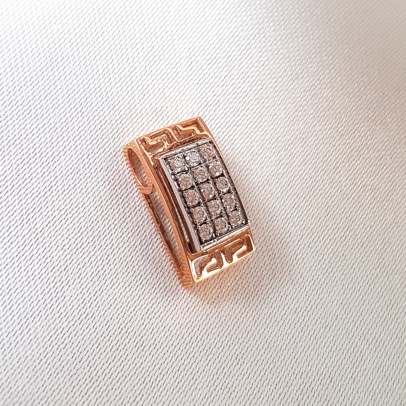 Kullast ripats tsirkoonidega. Pikkus 1,6 cm, laius 0,8cm. Prooviga 585. Kaal 1,78g.