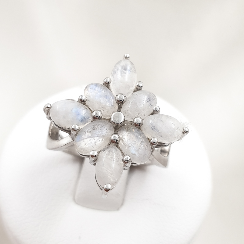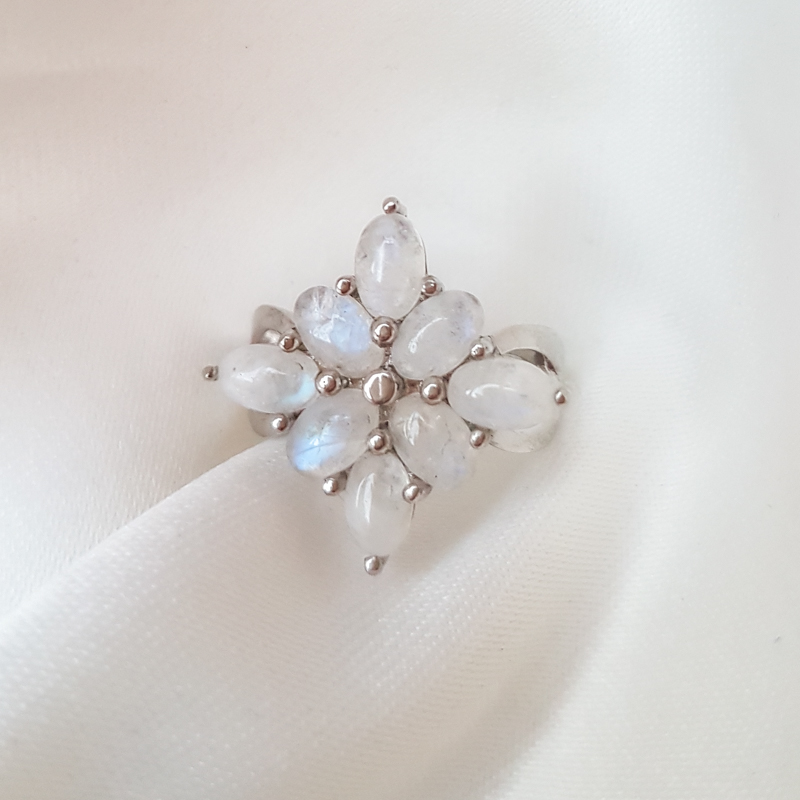 Kaunikujuline ja naiselik kuukividega hõbesõrmus. Prooviga 925, kaal 5,59g. Suurus 17.5