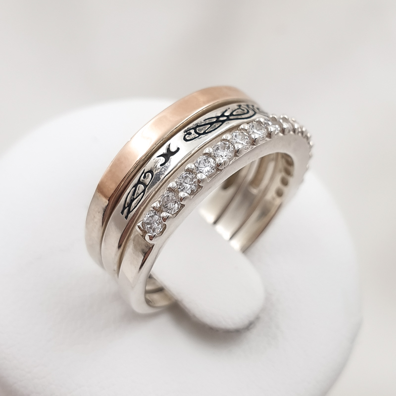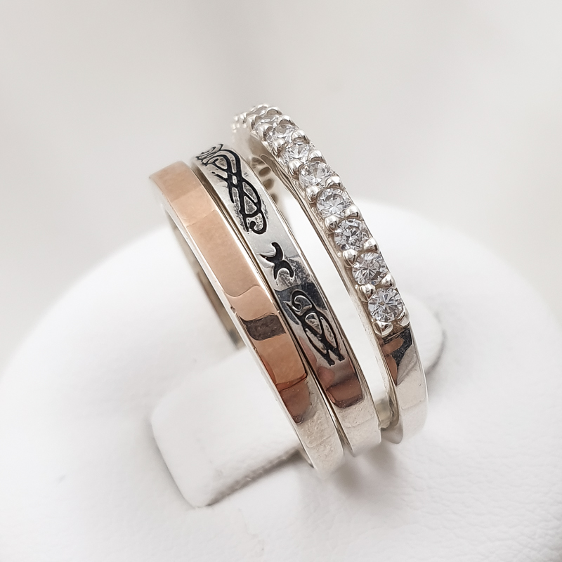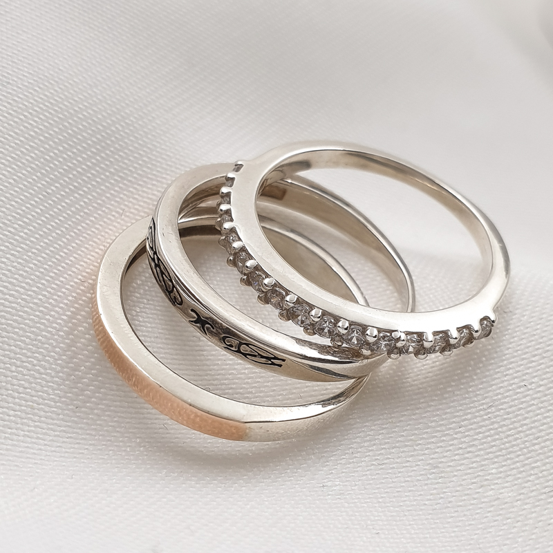 Kolmest hõbesõrmusest koosnev komplekt, tsirkoonkividega. Prooviga 925, kaal 5,36g. Suurus 17.5