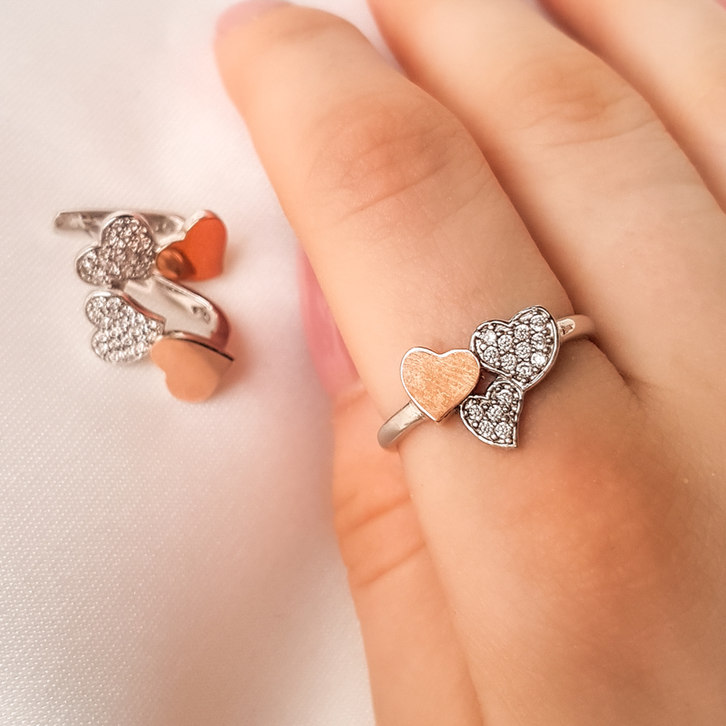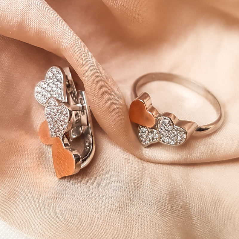 Hõbedast ehete komplekt – sõrmus ja kõrvarõngad tsirkoonkividega. 925 proovis. Sõrmus saadaval suurustes 17, 18.5 ja 19. Kirjuta palun ostukorvis kommentaari, millist suurust soovid. Sõrmuse kaal 2,4g. Kõrvarõngad inglise lukuga ja kaaluga 3,17g. Tooteid on võimalik soetada ka eraldi, selleks sisesta otsingusse toote nimi: Hearts.