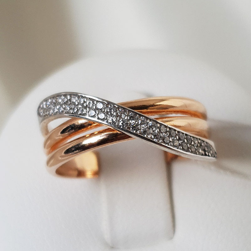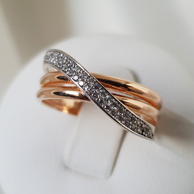 Kauni disainiga kuldsõrmus, mida kaunistavad tsirkoonkivid. 585 proovis punane kuld. Sõrmuse suurus 18 ja kaal 3,49g. Sõrmuse laius on 8mm