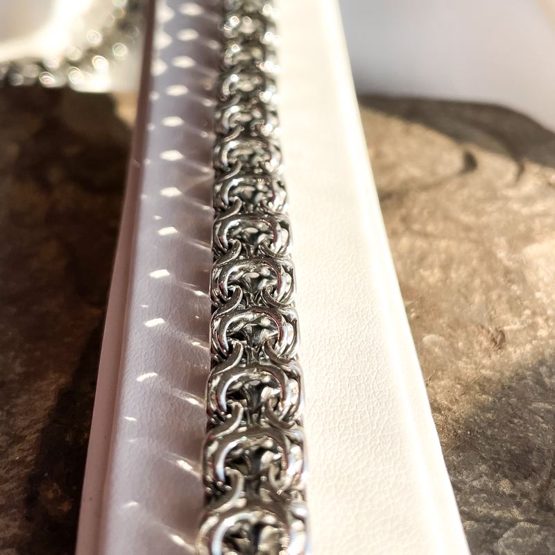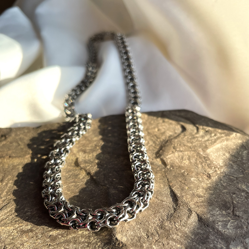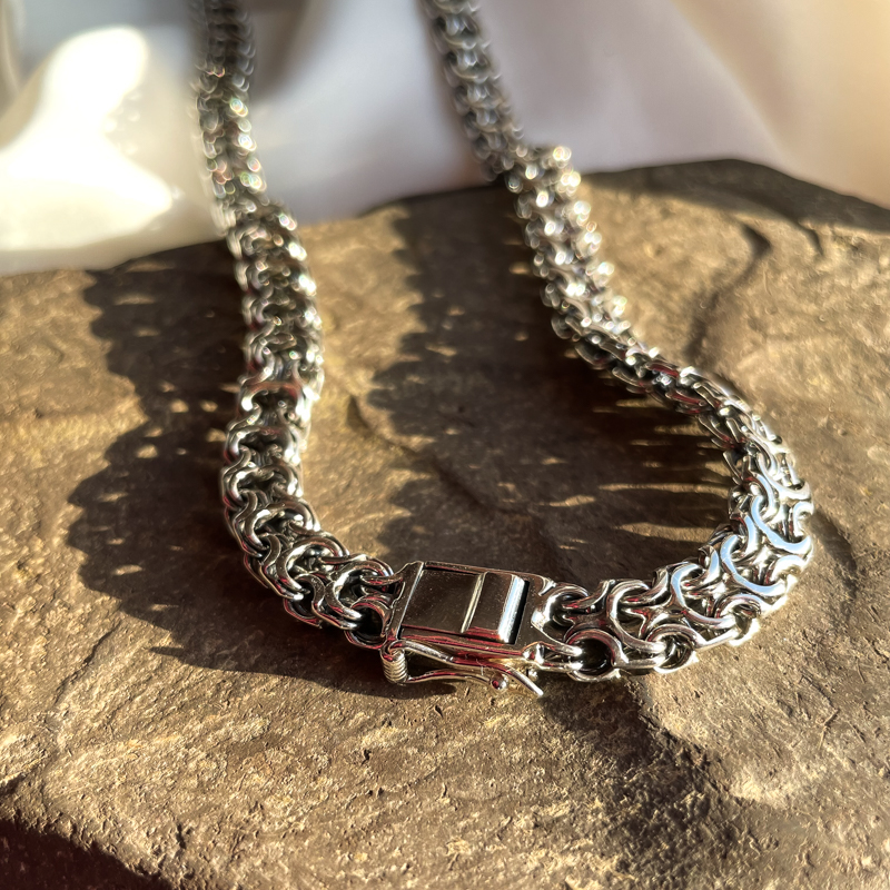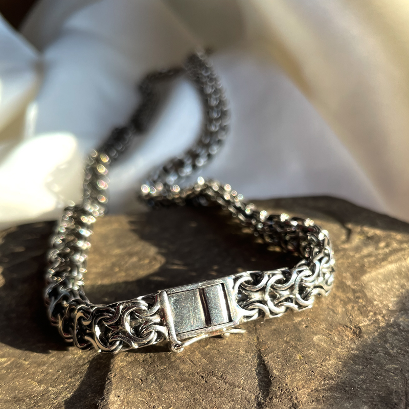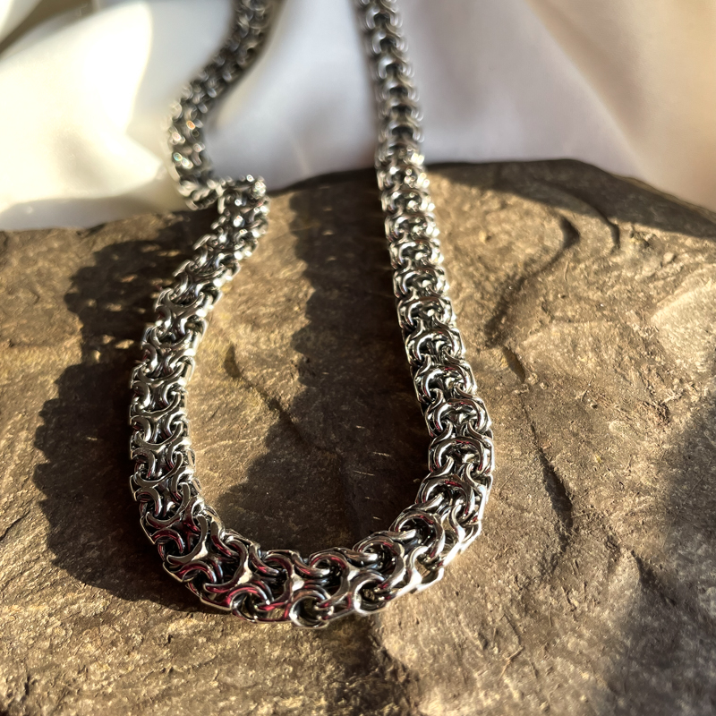 Hõbedast kaelakett. Oksüdeeritud. Karplukuga. Prooviga 925. Laius 8,7mm. Pikkus 60 cm. Kaal 65,99g