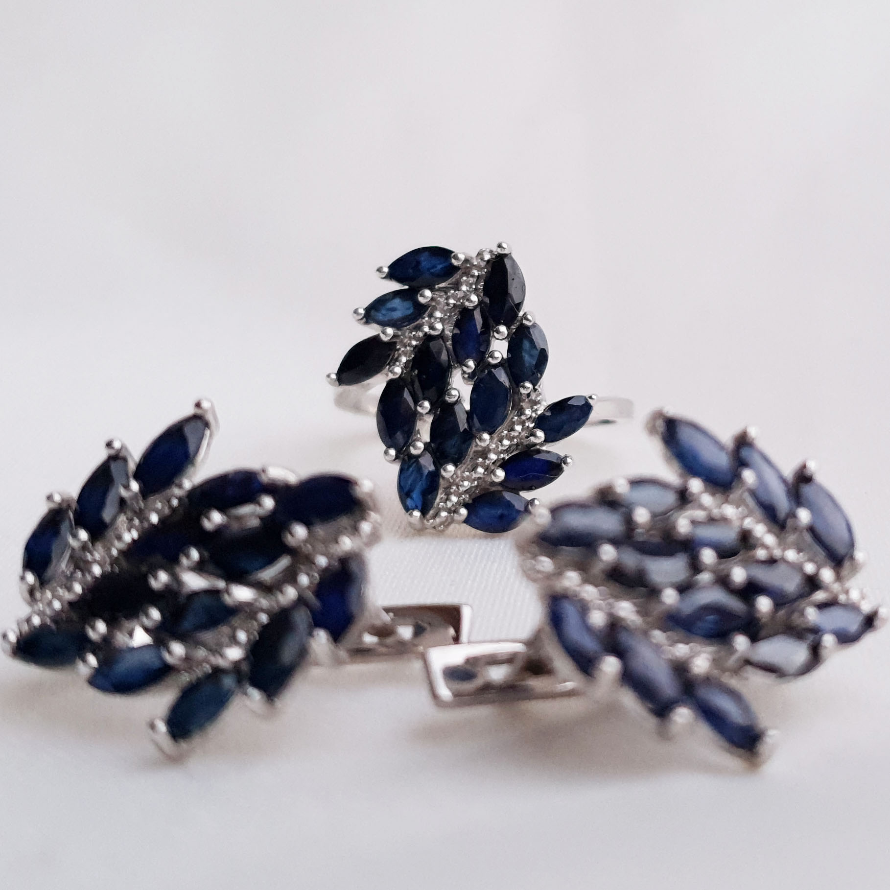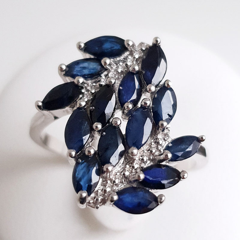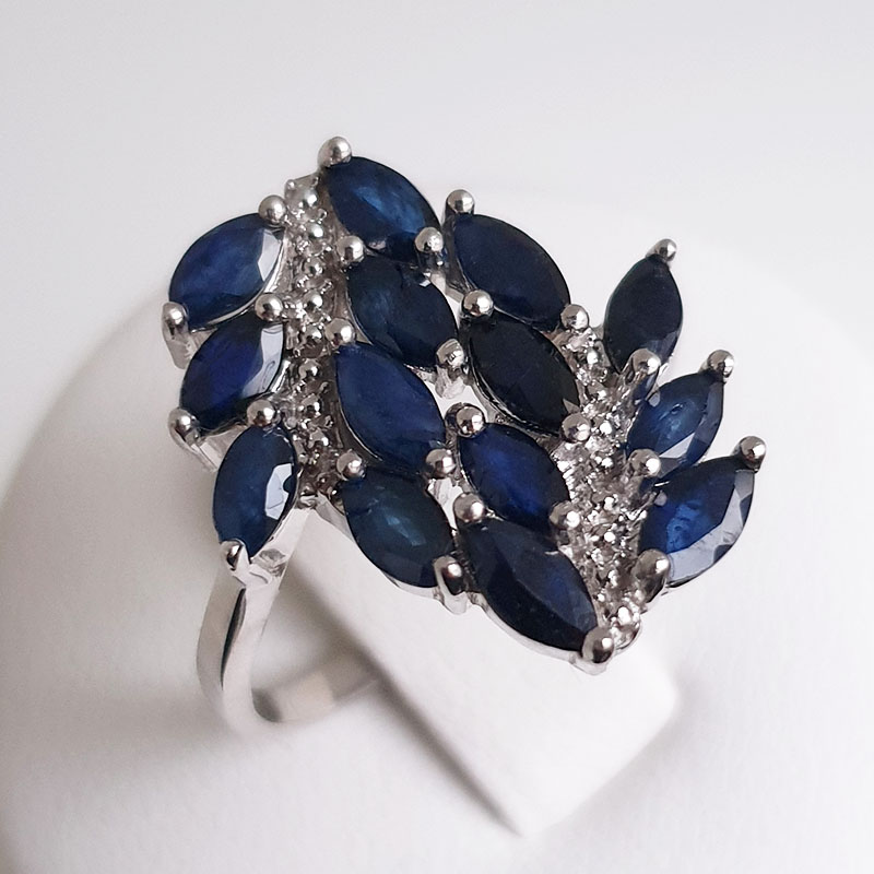 925 proovis rodeeritud hõbesõrmus naturaalsete safiiridega (2,52ct). Sõrmuse kaal 3,62g. Sõrmuse suurus 18,5.