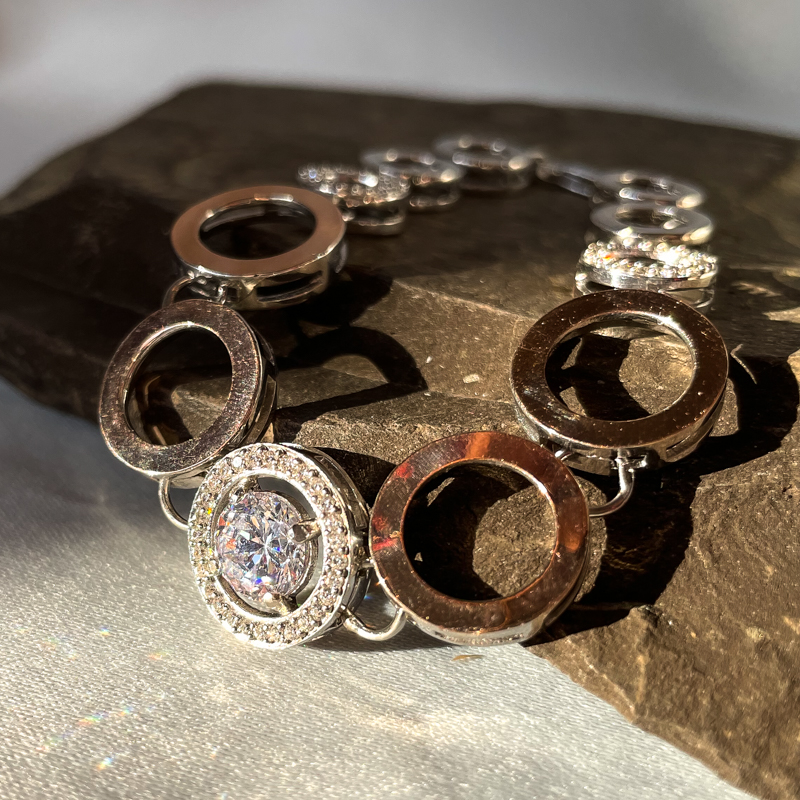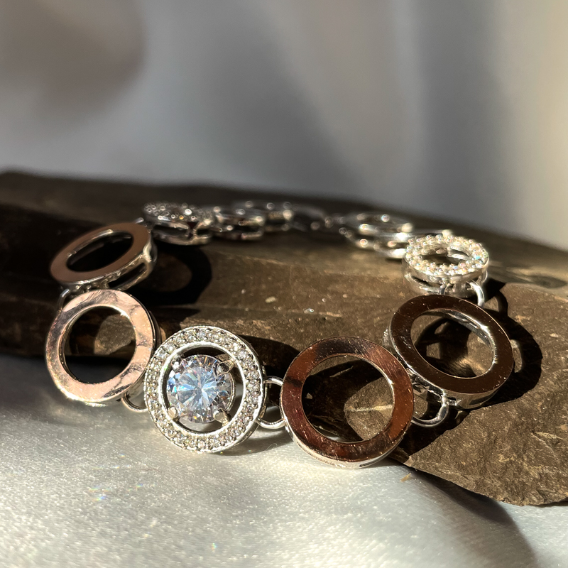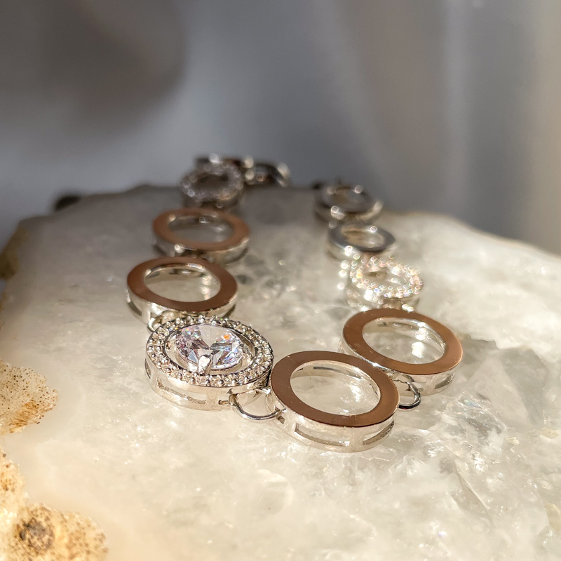 Kaunis, soliidne ja särav hõbedast käekett tsirkoonidega. Prooviga 925. Pikkus 18,5cm. Kaal 14,45g.