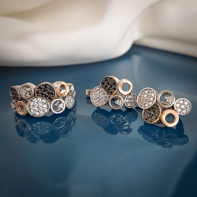 Hõbedast ehete komplekt – sõrmus ja kõrvarõngad. Tsirkoonkividega. 925 proovis. Sõrmus suuruses 19. Sõrmuse kaal 6,03g. Kõrvarõngad inglise lukuga ja kaaluga 5,94g Tooteid on võimalik soetada ka eraldi, selleks sisesta otsingusse toote nimi: Josefa.