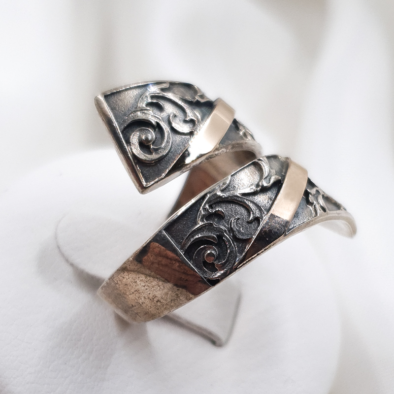 Antiikse stiiliga hõbesõrmus. 925 prooviga hõbe, 7,14g. Lisatud 375 prooviga kulda, 0,15g. Kogukaal 7,29g. Saadaval suurused 17,5; 18,5 ja 20,5.