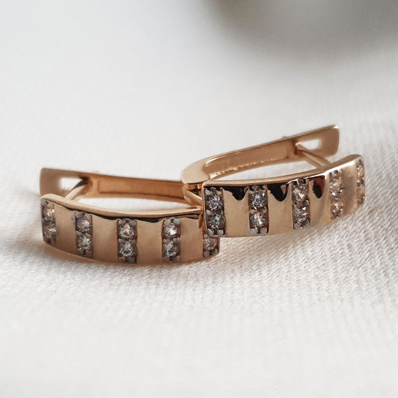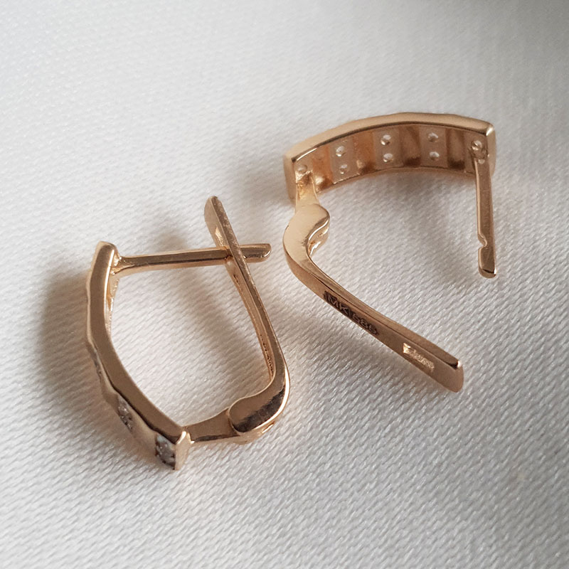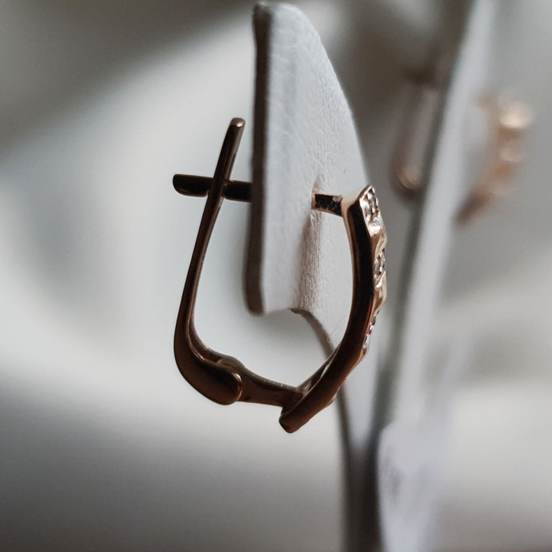 585 proovis punane kuld, kaal 1,87 grammi. Kinnituvad inglise lukuga. Kõrvarõngaid kaunistavad tsirkoonid.