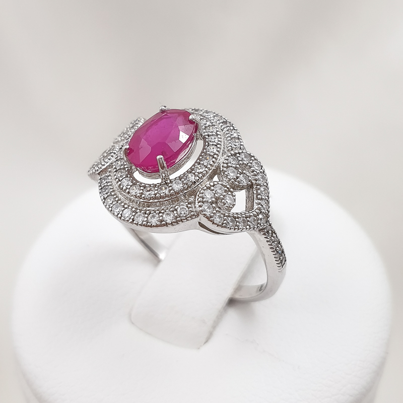 Roosa rubiini ja tsirkoonidega hõbesõrmus. Prooviga 925, kaal 3,15g. Suurus 17.3