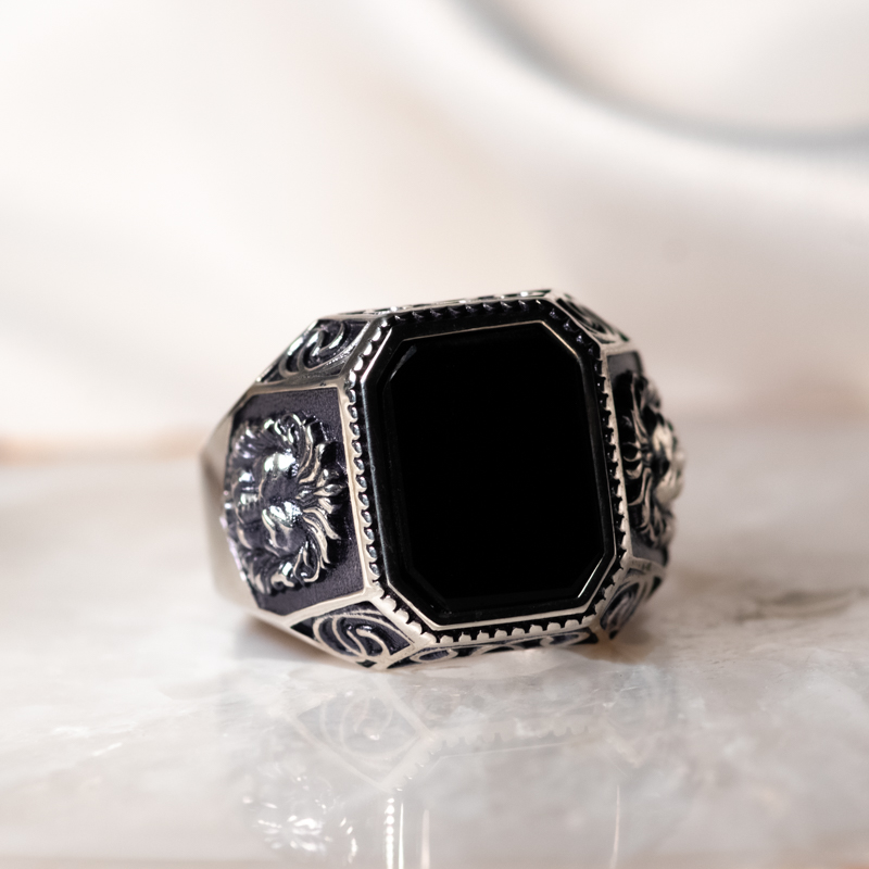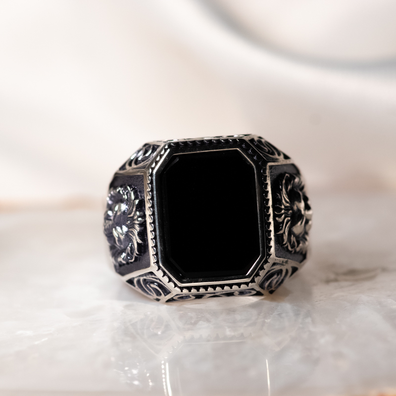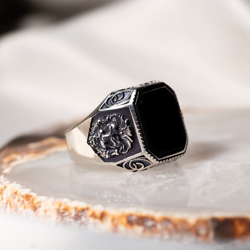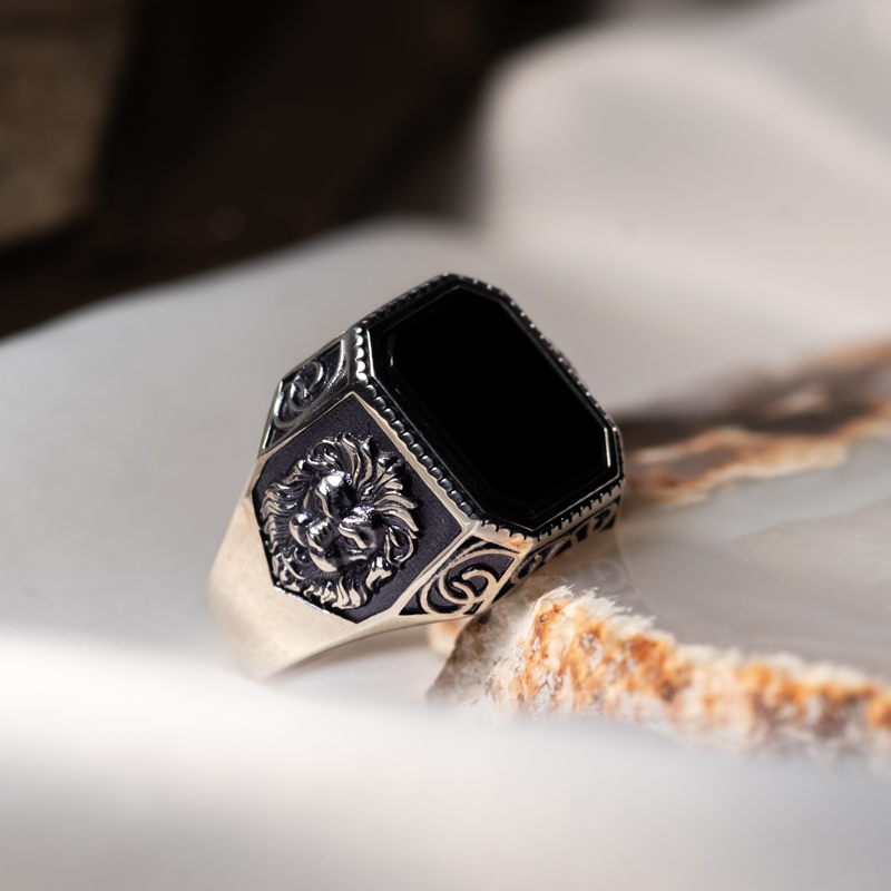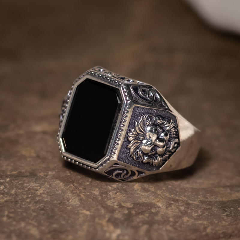 Lõvipeaga ja oonüksiga hõbesõrmus. Prooviga 925, kaal 8.18g. Suurus 20