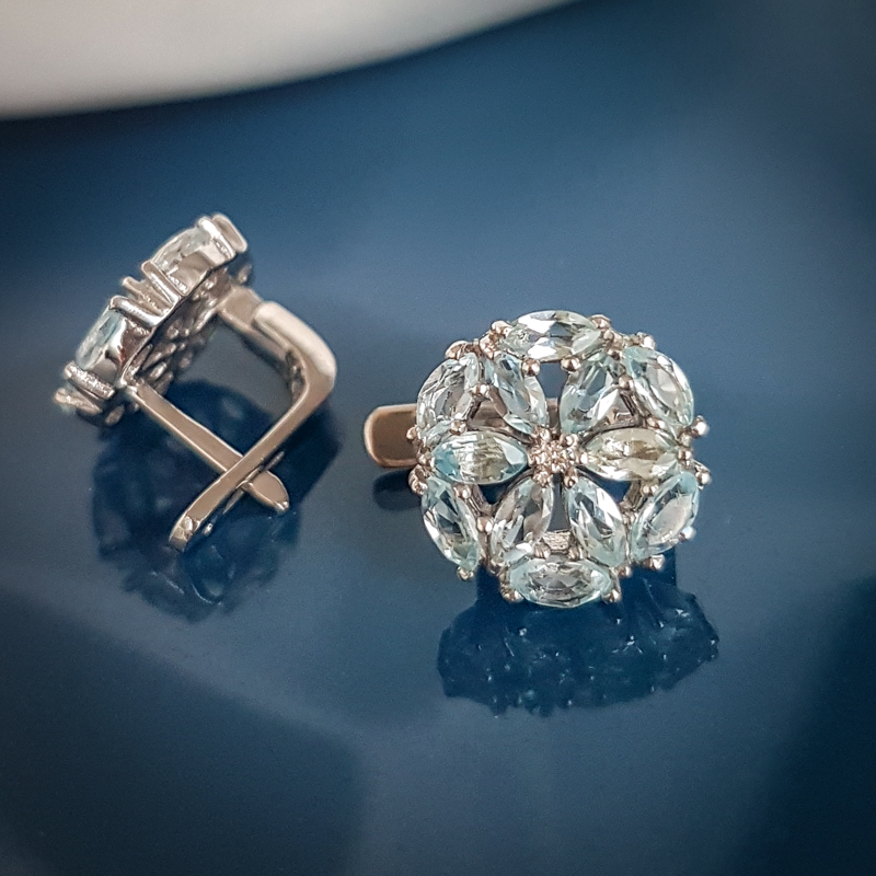 Hõbekõrvarõngad taevasiniste topaaside ja tsirkoonidega. Inglise lukuga. Prooviga 925. Kaal 4,2g