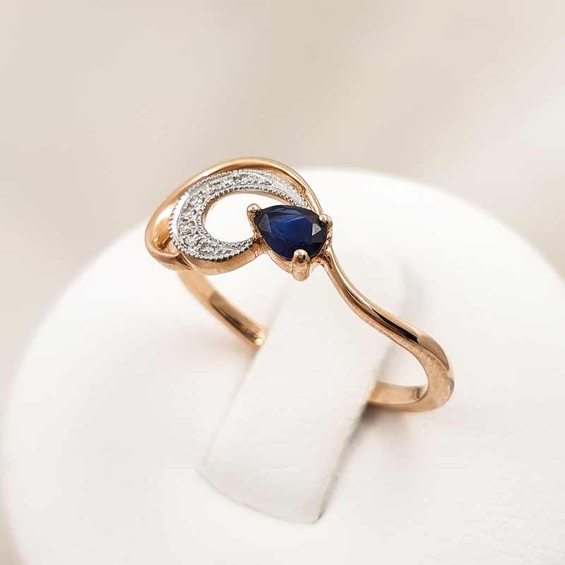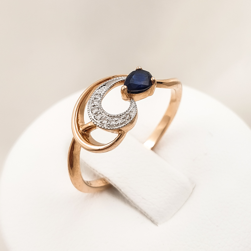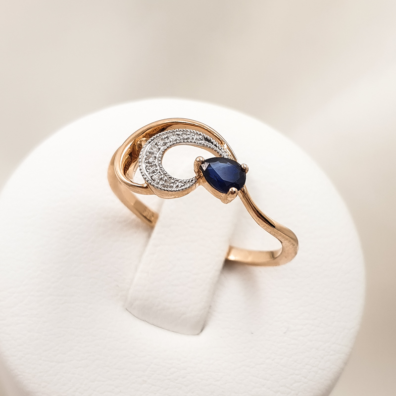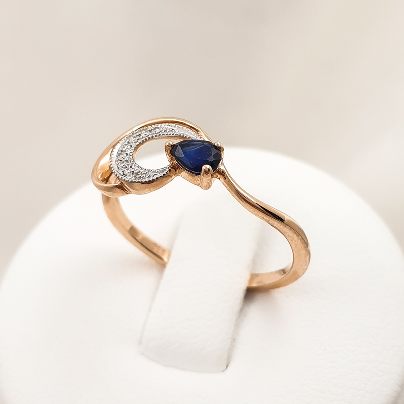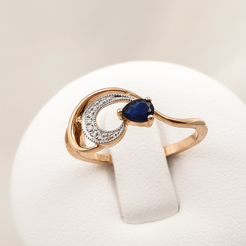 Pilkupüüdev safiiri- ja teemantidega kuldsõrmus. Prooviga 585, kaal 1,77g. Suurus 17