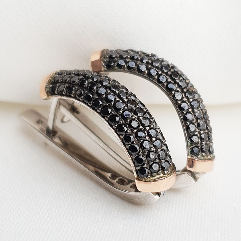 Roodiumiga kaetud 925 proovis hõbe. Kõrvarõngaid kaunistavad rohked sügavmustad tsirkoonid. Pealmist osa on kaunistavad 375 proovis kullast detailid (0,07g Au375). Kinnituvad inglise lukuga. Kaal 4,48 grammi.